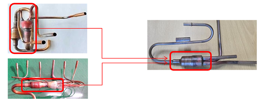 - 냉매가스 흐름 시 부분 조립을 한 후 가스 누설 불량률 감소 및 억제(보완)하는 제품(분배기 부분 Crack발생 현상)이다.